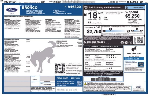 Factory MSRP: $65,730 $4,711 off MSRP! 2026 Ford Bronco Badlands Avalanche 4WD 10-Speed Automatic 2.3L EcoBoost I-4