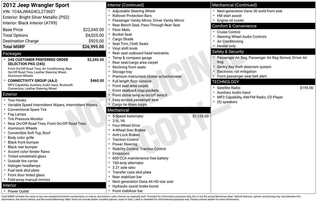 With its impressive features, robust performance, and unparalleled off-road prowess, the 2012 Jeep Wrangler Sport is a true icon of the SUV world. Discover the freedom and adventure that await you behind the wheel of this remarkable vehicle. We look forward to helping you find your perfect match.