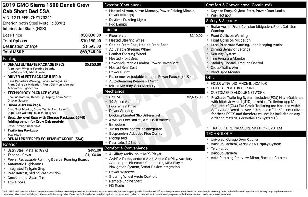 - Perimeter Lighting, Heavy-Duty Rear Locking Differential, 170 Amp Alternator, Auxiliary External Transmission Oil Cooler, Chrome Assist Steps, GMC MultiPro Power Steps, High-Capacity Air Filter, Hitch Guidance, IntelliBeam Automatic High Beam On/Off, LED Cargo Area Lighting, Rear Wheelhouse Liners, Signature Denali Grille, Spray-On Pickup Bed Liner w/Denali Logo
