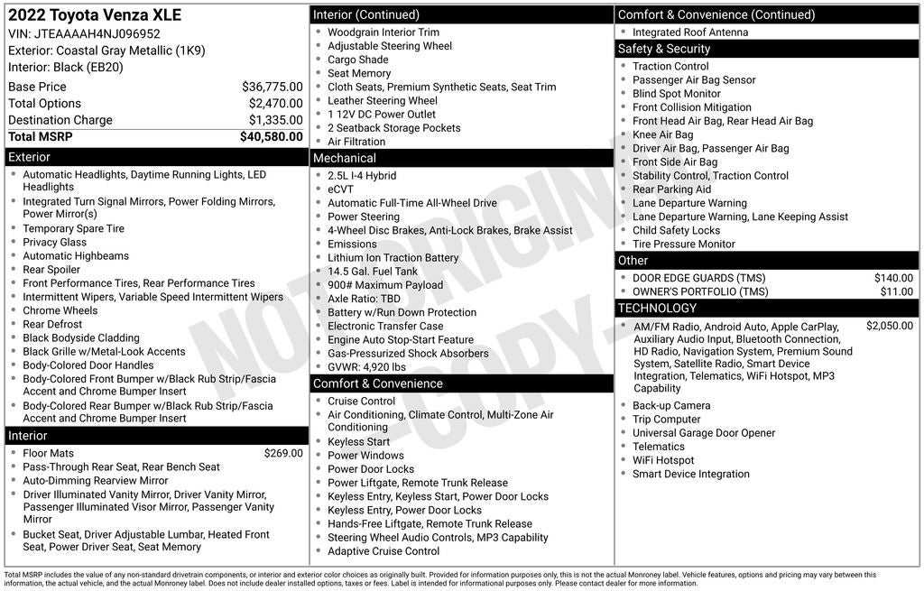 The 2022 Venza XLE comes equipped with a host of premium features, including: