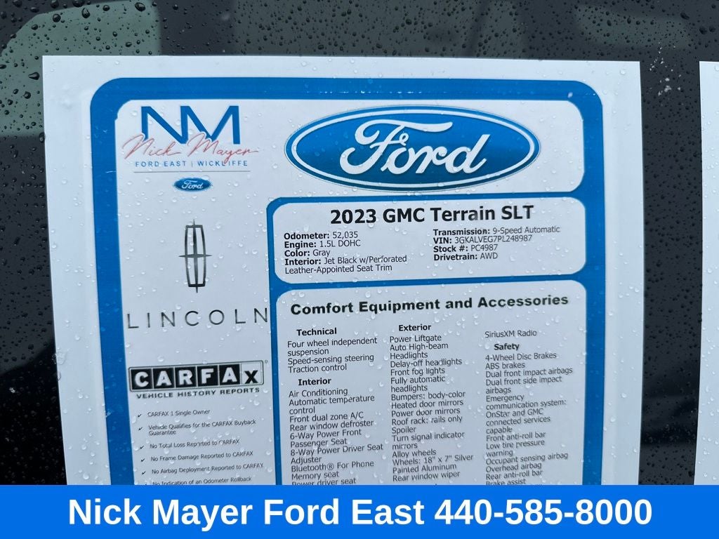 Nick Mayer Ford East Wickliffe is proud to offer this handsome 2023 GMC Terrain in Gray This vehicle has been thoroughly inspected, ready to take home, and comes with the following features; AWD, 2 USB Data Ports, 2 USB Data Ports w/SD Card Reader, 3.47 Axle Ratio, 4-Wheel Disc Brakes, 6 Speakers, 6-Speaker Audio System Feature, 6-Way Power Front Passenger Seat, 8-Way Power Driver Seat Adjuster, ABS brakes, Air Conditioning, Alloy wheels, AM/FM radio: SiriusXM, Auto High-beam Headlights, Auto-dimming Rear-View mirror, Automatic temperature control, Bluetooth® For Phone, Brake assist, Bumpers: body-color, Compass, Delay-off headlights, Driver & Front Passenger Heated Seats, Driver door bin, Driver vanity mirror, Dual front impact airbags, Dual front side impact airbags, Electronic Stability Control, Emergency communication system: OnStar and GMC connected services capable, Four wheel independent suspension, Front anti-roll bar, Front Bucket Seats, Front Center Armrest, Front dual zone A/C, Front fog lights, Front Passenger 2-Way Power Lumbar, Front reading lights, Fully automatic headlights, Garage door transmitter, Heated door mirrors, Heated front seats, Heated steering wheel, Illuminated entry, Lane Departure Warning System, Low tire pressure warning, Memory seat, Occupant sensing airbag, Outside temperature display, Overhead airbag, Overhead console, Panic alarm, Passenger door bin, Passenger vanity mirror, Perforated Leather-Appointed Seat Trim, Power door mirrors, Power Driver Lumbar Control, Power driver seat, Power Liftgate, Power passenger seat, Power steering, Power windows, Radio data system, Radio: GMC Infotainment Audio System w/8 Display, Rear anti-roll bar, Rear seat center armrest, Rear window defroster, Rear window wiper, Remote keyless entry, Roof rack: rails only, Security system, SiriusXM Radio, Speed control, Speed-sensing steering, Split folding rear seat, Spoiler, Steering wheel mounted audio controls, Tachometer, Telescoping steering wheel, Tilt steering wheel, Traction control, Trip computer, Turn signal indicator mirrors, Variably intermittent wipers, Wheels: 18 x 7 Silver Painted Aluminum, and Wireless Apple CarPlay/Wireless Android Auto.