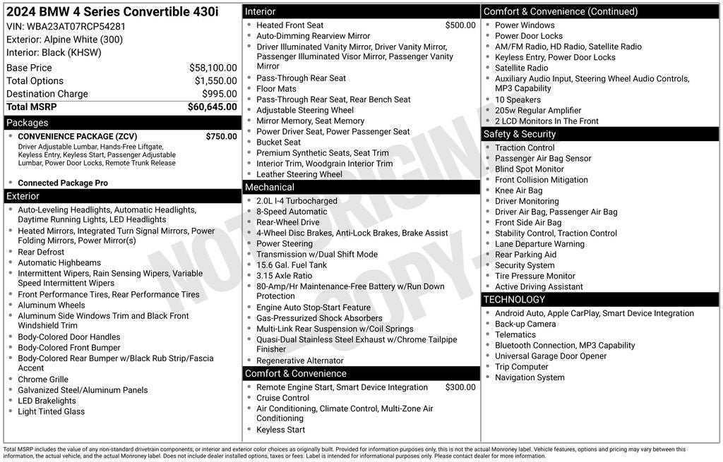 Nick Mayer Ford East Wickliffe is proud to offer this terrific-looking 2024 BMW 4 Series in Alpine White This vehicle has been thoroughly inspected, ready to take home, and comes with the following features; Connected Package Pro, 10 Speakers, 4-Wheel Disc Brakes, ABS brakes, Air Conditioning, Alloy wheels, AM/FM Radio, AM/FM radio: SiriusXM with 360L, Apple CarPlay & Android Auto Compatibility, Auto High-beam Headlights, Auto-dimming door mirrors, Auto-dimming Rear-View mirror, Automatic temperature control, BMW Assist eCall, BMW TeleServices, Brake assist, Bumpers: body-color, Compass, ConnectedDrive Services, Convertible roof lining, Convertible roof wind blocker, Delay-off headlights, Driver door bin, Driver vanity mirror, Dual front impact airbags, Dual front side impact airbags, Electronic Stability Control, Emergency communication system: BMW Assist eCall, Enhanced USB & Bluetooth® w/Smartphone Integration, Exterior Parking Camera Rear, Four wheel independent suspension, Front anti-roll bar, Front Bucket Seats, Front Center Armrest, Front dual zone A/C, Front reading lights, Fully automatic headlights, Garage door transmitter, Genuine wood console insert, Genuine wood dashboard insert, Glass rear window, Heated door mirrors, Hi-Fi Sound System, Illuminated entry, Integrated roll-over protection, Knee airbag, Leather steering wheel, Low tire pressure warning, Memory seat, Navigation, Navigation System, Occupant sensing airbag, Outside temperature display, Overhead console, Panic alarm, Passenger door bin, Passenger vanity mirror, Perforated SensaTec Upholstery, Power convertible roof, Power door mirrors, Power driver seat, Power Front Seats, Power passenger seat, Power steering, Power windows, Radio data system, Rain sensing wipers, Rear anti-roll bar, Rear reading lights, Rear seat center armrest, Rear window defroster, Remote keyless entry, Security system, SiriusXM w/360L, Speed control, Speed-sensing steering, Speed-Sensitive Wipers, Sport Seats, Sport steering wheel, Steering wheel mounted audio controls, Tachometer, Telescoping steering wheel, Tilt steering wheel, Traction control, Trip computer, Turn signal indicator mirrors, Variably intermittent wipers, Wheels: 18 x 7.5 V-Spoke Bi-Color Orbit Grey, and Widescreen Display.