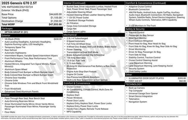Elevate your daily commute or weekend adventures with the premium amenities of this 2025 Genesis G70 2.5T. From the advanced infotainment system to the luxurious seating surfaces, every detail has been carefully crafted to provide a truly exceptional driving experience.