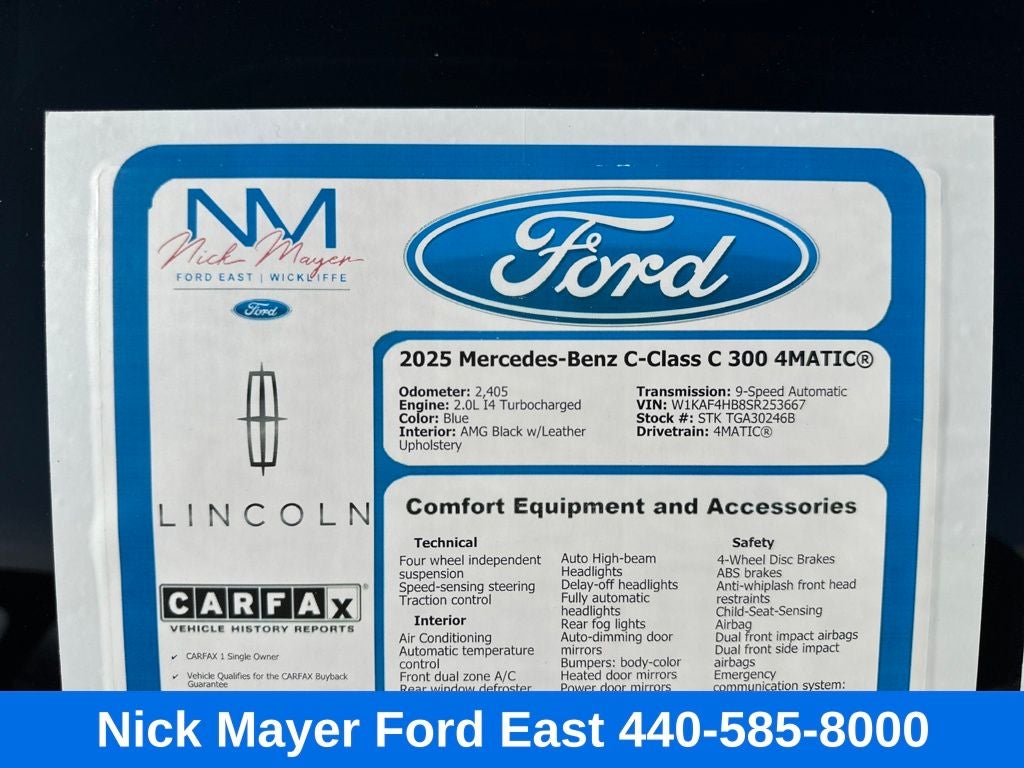 Nick Mayer Ford East Wickliffe is proud to offer this outstanding 2025 Mercedes-Benz C-Class in Black This vehicle has been thoroughly inspected, ready to take home, and comes with the following features; 4MATIC®, 11.9 Center Touchscreen Display, 18 5-Spoke Wheels, 4-Wheel Disc Brakes, 5 Speakers, ABS brakes, Air Conditioning, Alloy wheels, AM/FM radio: SiriusXM, Anti-whiplash front head restraints, Apple CarPlay®/Android Auto®, Auto High-beam Headlights, Auto tilt-away steering wheel, Auto-dimming door mirrors, Auto-dimming Rear-View mirror, Automatic temperature control, Brake assist, Bumpers: body-color, Child-Seat-Sensing Airbag, Compass, Delay-off headlights, Driver door bin, Driver vanity mirror, Dual front impact airbags, Dual front side impact airbags, Electronic Stability Control, Emergency communication system: Mercedes-Benz Emergency Call Service, Exterior Parking Camera Rear, Four wheel independent suspension, Front anti-roll bar, Front Bucket Seats, Front Center Armrest, Front dual zone A/C, Front reading lights, Fully automatic headlights, Garage door transmitter: HomeLink, Genuine wood dashboard insert, Head restraints memory, Heated door mirrors, Heated front seats, Illuminated entry, Knee airbag, Leather steering wheel, Low tire pressure warning, Lumbar Support, MB-Tex Upholstery, Memory seat, Occupant sensing airbag, Outside temperature display, Overhead airbag, Overhead console, Panic alarm, Passenger door bin, Passenger vanity mirror, Power adjustable front head restraints, Power door mirrors, Power driver seat, Power Heated Front Seats with Memory, Power moonroof, Power passenger seat, Power steering, Power windows, Premium audio system: MBUX, Radio data system, Radio: FrontBass 5-Speaker Audio System, Rain sensing wipers, Rear anti-roll bar, Rear fog lights, Rear reading lights, Rear seat center armrest, Rear window defroster, Remote keyless entry, Security system, SiriusXM Satellite Radio, Speed control, Speed-sensing steering, Split folding rear seat, Steering wheel memory, Steering wheel mounted audio controls, Tachometer, Telescoping steering wheel, Tilt steering wheel, Traction control, Trip computer, Turn signal indicator mirrors, Variably intermittent wipers, and Weather band radio.